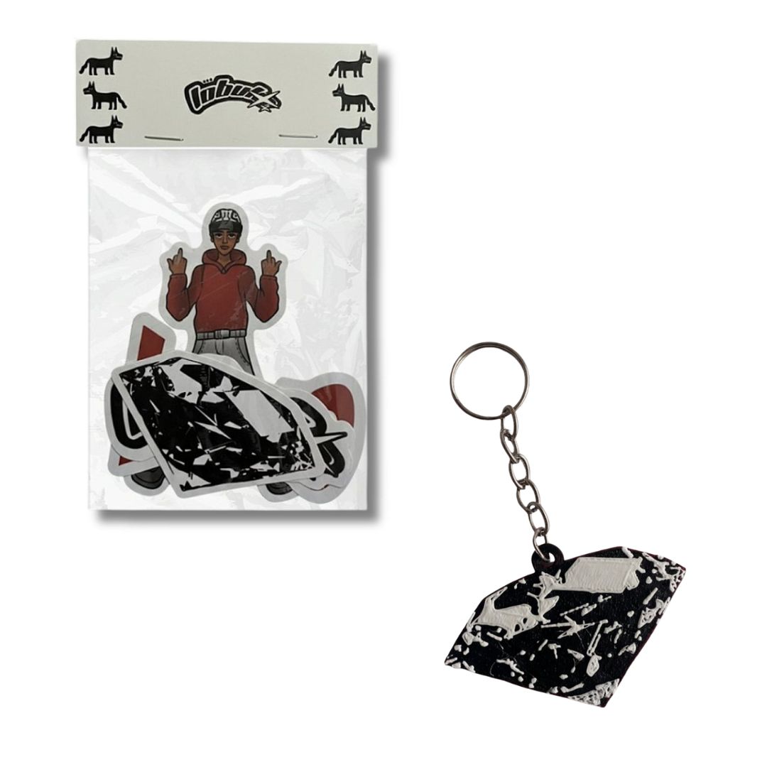 Produzido em vinil resistente à prova d’água, o conjunto acompanha embalagem em celofane e é vendido como pack, incluindo 1 chaveiro 3D com corte especial, criado especialmente para a colaboração.