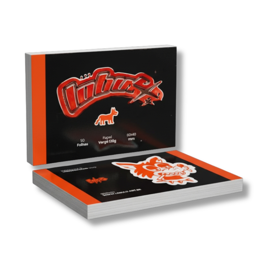Material: papel vergê Dimensões: 40 mm x 60 mm Quantidade: 50 folhas Personalização: impressão com arte na frente e no verso